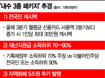 17일 기획재정부에 따르면 이 같은 내용의 ‘내수 활성화 3종 패키지’가 추경안에 포함될 것으로 전해졌다. 정부 관계자는 지역화폐 추가 발행에 대해 "코로나19로 위기를 겪는 지역 소상공인·자영업자를 도와 내수 경기를 진작하기 위한 취지"라고 설명했다.오는 3분기 월평균 신용카드 사용액이 2분기보다 늘어난 경우 1인당 최대 30만원을 돌려주는 ‘캐시백’ 정책도 추경안에 담길 전망이다. 다만 음식점과 숙박 등 소상공인과 자영업자에 대한 소비에 한정된다. 전국민 대상 재난지원금 지급이 사실상 어려워지면서 이를 대체하기 위한 대책으로 나온 것이다.
