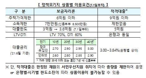 금융위 관계자는 "제도 개선사항은 7월 1일 대출 신청분부터 적용된다"며 "초장기모기지 상품의 경우 민간 부문에서도 도입될 수 있도록 다양한 방안을 하반기 중 검토해보겠다"고 말했다.
