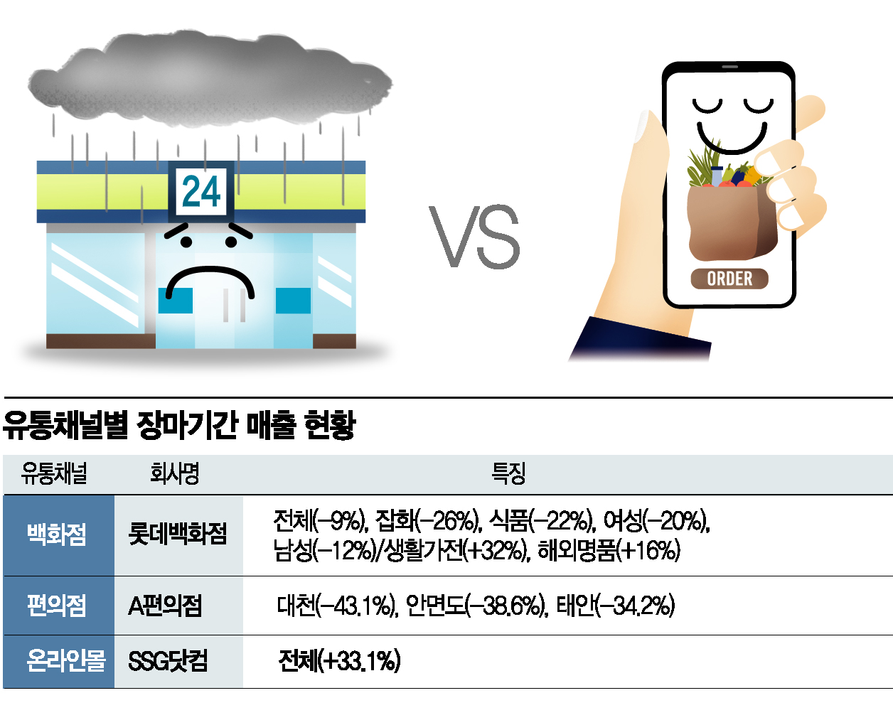 ◆장마에 편의점, 백화점에는 손님 발길 뚝= 8일 유통업계에 따르면 주요 관광지의 최근 편의점 매출은 반토막이 났다. 예년 때라면 편의점에는 맥주, 아이스크림을 등을 찾는 손님들로 북적여야 하지만 큰비가 계속되며 손님 발길이 뚝 끊겼기 때문이다.