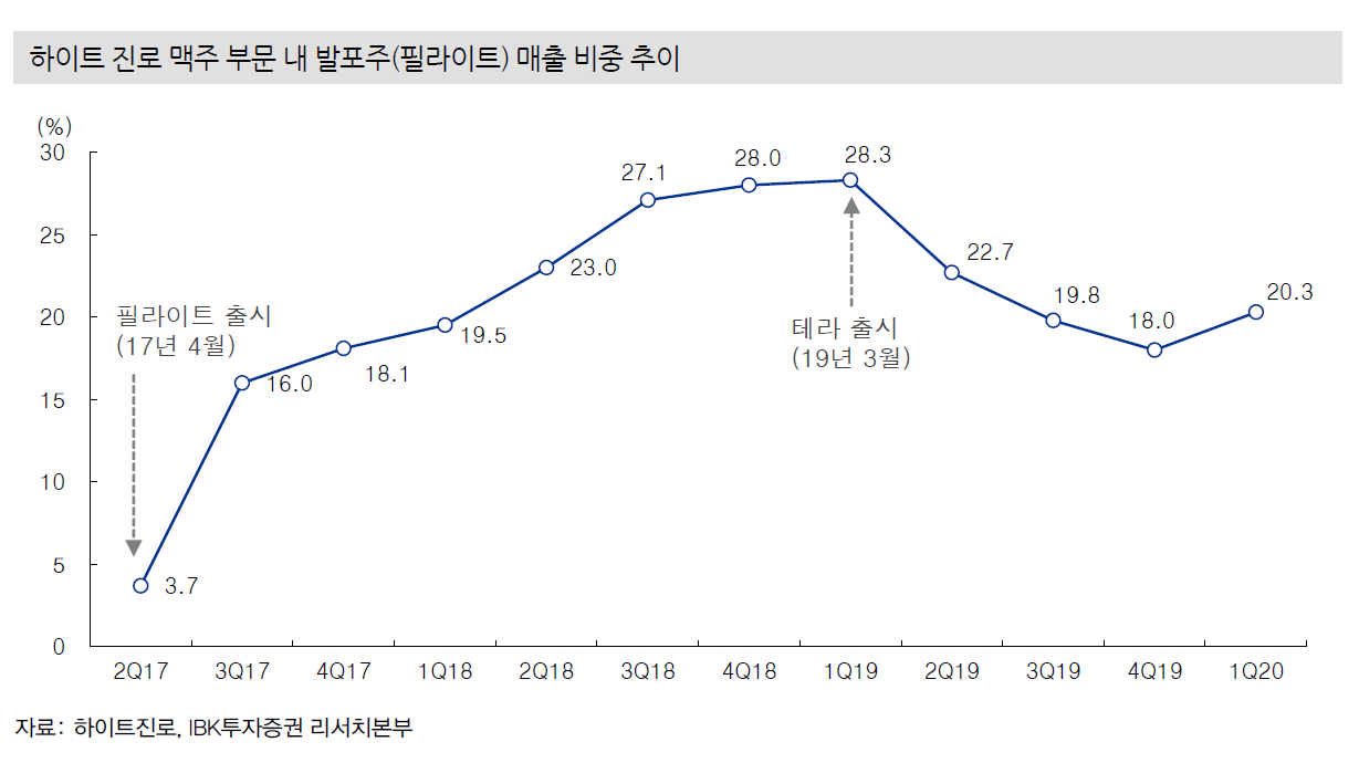 필라이트의 하이트진로 맥주 부문 내 매출비중은 출시 당시 2017년 2분기 3.7%에서 지난해 1분기 28.3% 까지 단기간 사이 크게 확대됐다. 이후 테라 출시에 따른 영향으로 매출 비중은 다소 감소했지만 코로나19 확산이 시작된 올 초부터 다시 비중이 확대돼 현재 20.3% 수준을 유지 중이다.