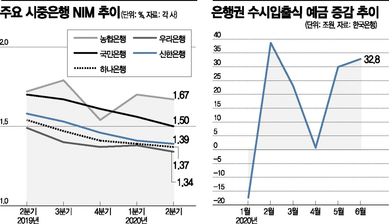 조달비용을 낮추기 위해 수시입출금계좌ㆍ단기저축성예금 등 저원가성 예금을 확대하는 전략도 계속되고 있다. 정기예금 등 저축성 예금에 비해 고객에게 내줘야 할 이자가 상대적으로 적기 때문이다. 실제로 한국은행에 따르면 수시입출식 예금의 증가폭은 5월 29조9000억원, 6월 32조8000억원으로 법인 및 개인 자금을 중심으로 큰 폭의 증가세를 지속했다. 반면 정기예금은 5월에 3조3000억원 감소한 데 이어 6월에는 9조8000억원으로 감소폭이 확대됐다.