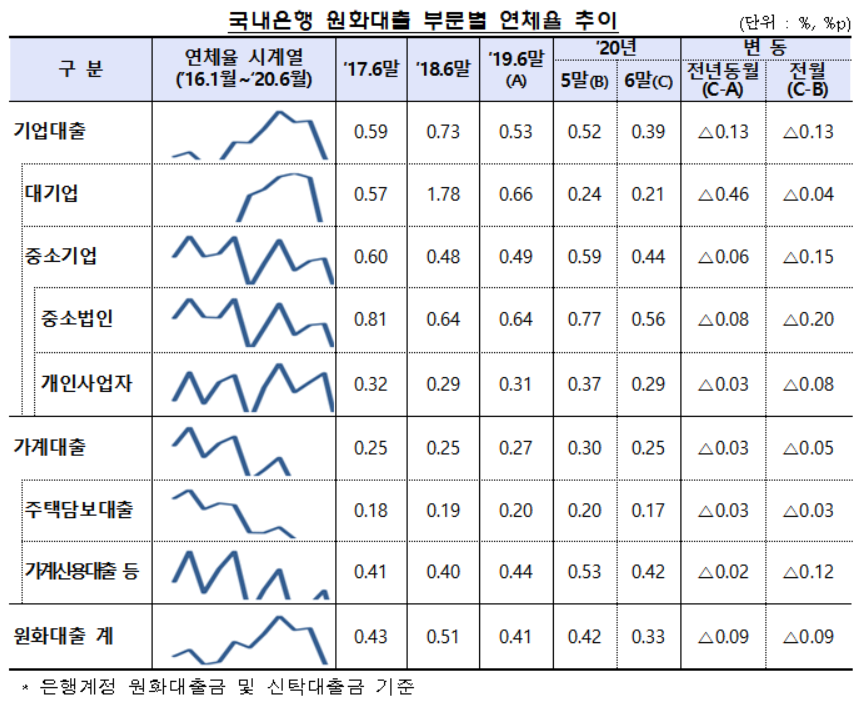 이 시기 기업대출 연체율은 0.39%로 전월 말(0.52%)보다 0.13%포인트 하락했다. 기업대출 중 대기업대출의 연체율은 0.21%로 집계됐다. 0.24%였던 전월 말에 견줘 0.04%포인트 내려갔다.