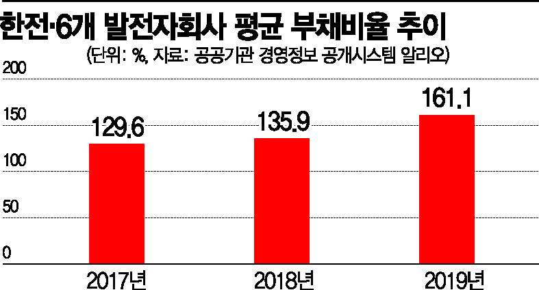 공기업들은 2030년까지 재생에너지 발전량 비중을 20%까지 높이는 '재생에너지3020' 정책에 부응하기 위해 화력발전소의 환경 설비를 개선하거나 신재생에너지 투자를 늘렸다. 부족한 자금은 빚을 내서 충당했다. 그러다 보니 부채는 눈덩이처럼 커지고 있다. 한국중부발전은 2019년 사업보고서를 통해 "친환경ㆍ저탄소 석탄발전과 신재생에너지사업 투자 확대로 2019년 부족 자금이 1조원 이상 발생했다"며 "부족 자금은 국내외 회사채 발행 등을 통해 외부에서 조달하고 있다"고 밝혔다.빚에 허덕이는 에너지 공기업들비용 대비 수익 달성이 불확실한 대규모 신재생에너지 설비 투자를 급하게 늘리다 보니 적자 경영에서 벗어나지 못하고 있다. 지난해 말 한국동서발전의 관계사인 한국해상풍력은 104억원, 공동 기업인 춘천에너지와 태백가덕산풍력발전 등은 각각 245억원, 16억원의 순손실을 기록했다. 동서발전 관계자는 "아직 건설 중인 사업이어서 투자비 집행에 따른 수익은 발생하지 않았다"고 말했다.