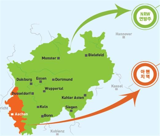 한-독 소재·부품·장비 기술협력센터가 세워진 독일 NRW(노르트라인베스트팔렌) 주와 아헨 지역 모습. 초록색이 NRW주, 주황색이 아헨 지역.(자료=산업통상자원부)