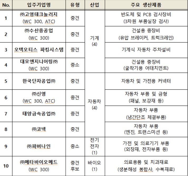 고영테크놀러지, 수산중공업, 오텍오티스 파킹시스템, 대모엔지니어링(이상 기계), 한국단자공업, 신영, 태양금속공업, 코넥(이상 자동차), 파버나인(전기전자), 메타바이오메드(바이오) 등 10개 업체가 센터에 입주한다.