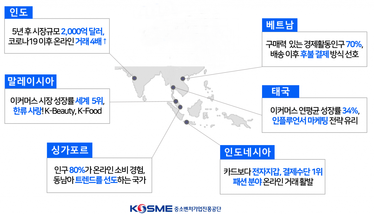 중소벤처기업진흥공단이 14일 발표한 '신남방 주요국 이커머스 시장 분석' 보고서에 따르면, 인도와 인도네시아, 태국, 베트남, 말레이시아, 싱가포르의 이커머스 시장이 크게 성장하고 있다. 이들 6개 국가의 이커머스 시장 규모는 1168억달러, 총 인구수는 18억4150만명에 달한다.