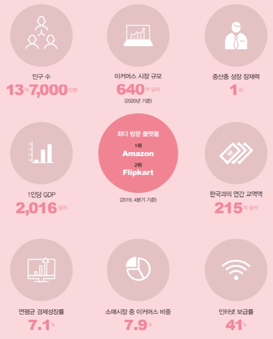 [아시아경제 김대섭 기자] 인도와 인도네시아 등 신남방 국가의 이커머스 시장이 한국 중소기업들의 수출 확대 거점으로 떠오르고 있다. 특히 신종 코로나바이러스감염증(코로나19) 확산 이후 젊은층을 중심으로 비대면(언택트) 시장이 급성장하면서 한류와 맞물려 한국 중소기업들의 새로운 시장 개척을 위한 기회를 주고 있다.