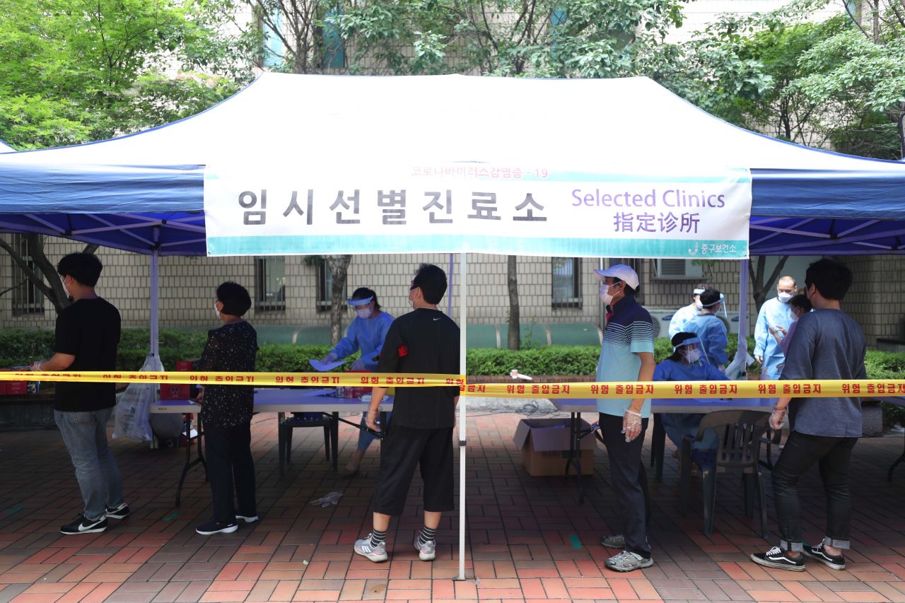 14일 신종 코로나바이러스 감염증(코로나19) 확진자가 발생한 서울 동대문 통일상가 인근에 마련된 코로나19 임시 선별진료소에서 시민들이 검체 검사를 받기 위해 대기하고 있다. /문호남 기자 munonam@