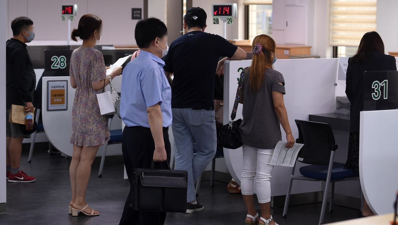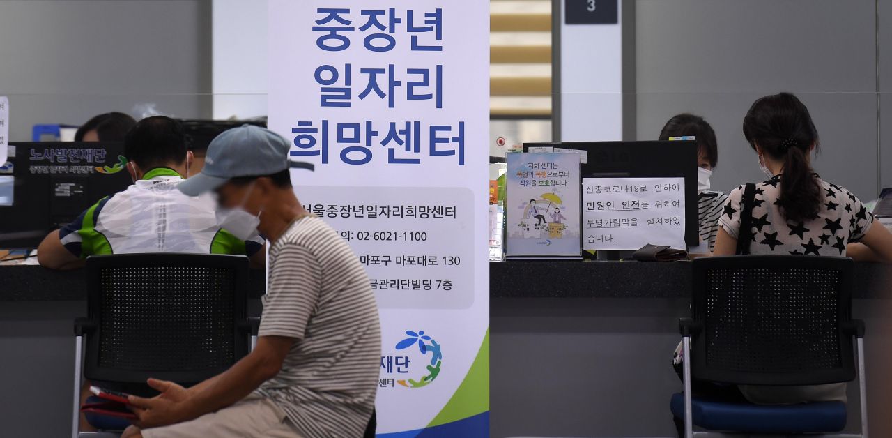 12일 서울 마포구 서울서부고용복지플러스센터를 찾은 구직자들이 실업급여와 취업 등의 상담을 받고 있다. 이날 통계청이 발표한 '7월 고용동향'에 따르면 지난달 취업자 수는 2천710만6천명으로, 1년 전보다 27만7천명 감소했다. 5개월 연속 감소세로 글로벌 금융위기 여파가 남아 있던 2009년 1∼8월에 8개월 연속 감소한 이후 11년만이다./김현민 기자 kimhyun81@