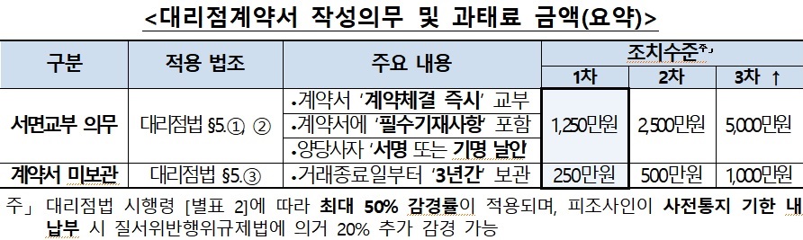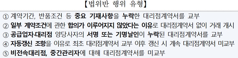 이외에도 ▲계약기간, 반품조건 등을 누락한 계약서 교부 ▲일부 계약조건 합의가 안 됐다고 계약서 없이 거래 ▲공급업자·대리점의 서명 또는 기명날인이 빠진 계약서 교부 ▲자동갱신 조항을 이유로 갱신 시 계속 계약서 미교부 ▲비전속대리점, 중간관리자에 대해 계약서 미교부 등 법 위반 사항이 발생했다.
