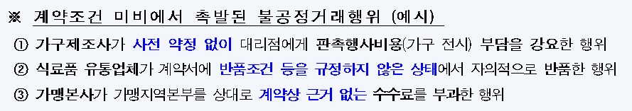 계약조건이 미비해 ▲가구제조사가 사전 약정 없이 대리점에 판촉행사비 부담을 강요하고 ▲식료품 유통업체가 계약서에 반품조건 등을 규정하지 않은 채 반품을 하며 ▲가맹본사가 가맹지역본부에 계약상 근거 없는 수수료를 부과하는 등의 사례가 발생해왔다.