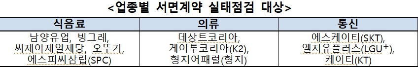 공정위는 남양유업, 빙그레, CJ제일제당, 오뚜기, SPC삼립(이상 식음료), 데상트코리아, K2코리아, 형지어패럴(의류), SK텔레콤, LG유플러스, KT 등 11개사의 서면계약 실태를 점검한 결과를 발표했다.