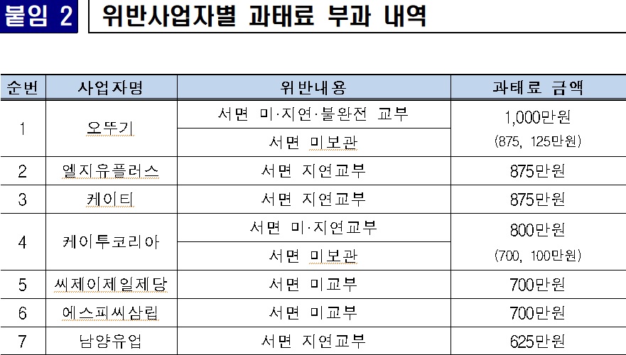 이에 공정위는 오뚜기 1000만원, LG유플러스 875만원, KT·K2코리아 800만원, SPC·CJ제일제당 700만원, 남양유업 625만원의 과태료를 부과했다.