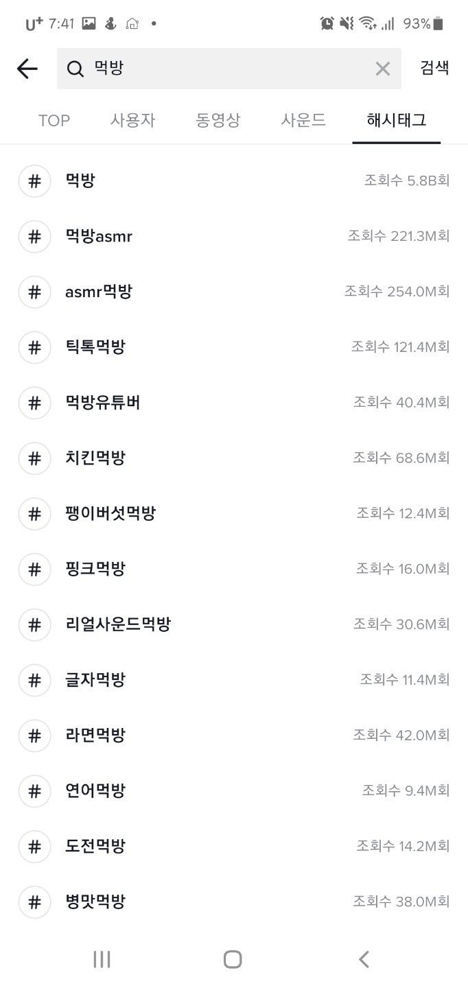 틱톡 내 먹방 콘텐츠 관련 해시태그들.