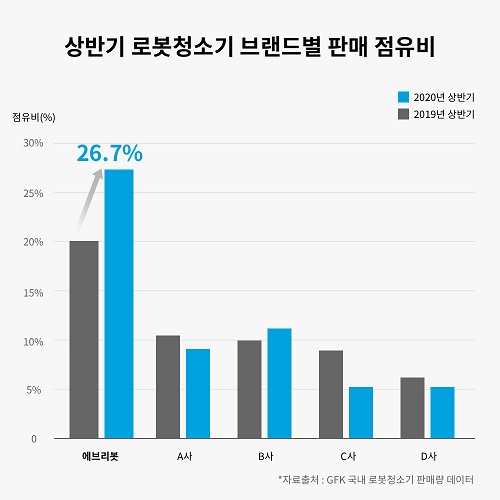 로봇전문기업 에브리봇이 주력 종목인 로봇청소기 시장에서 고공행진을 이어나가고 있다. 독일에 본사를 둔 글로벌 시장조사기관 GFK의 데이터에 따르면 에브리봇이 국내 로봇청소기 전체 시장에서 19년 1월부터 20년 6월까지 18개월 연속 판매량 점유비 1위를 차지한 것으로 나타났다.