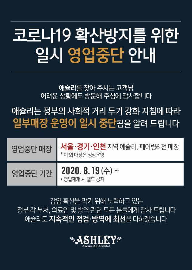 CJ푸드빌은 빕스·계절밥상 등 서울, 경기, 인천에 있는 총 36개 매장의 문을 닫았다. 빕스는 전국 41개 매장 중 29개, 계절밥상은 13개 매장 중 12개나 해당돼 손실이 불가피하다. 이랜드이츠는 애슐리·자연별곡·피자몰·로운·수사 등 5개 브랜드의 총 109개 매장 영업을 일시 중지했다. 신세계푸드도 보노보노 3곳, 올반 2개 매장 운영을 중단했다.