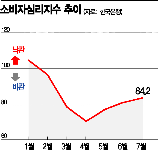 한은의 '7월 소비자동향조사'에 따르면 소비자심리지수(CCSI)는 84.2로 3개월 연속 상승했다. 7월 전(全)산업 기업경기실사지수(BSI) 역시 60을 기록해 전월대비 4포인트 올랐다. 7월 국내 카드승인액은 1년 전보다 4.8% 증가해 3달 연속 증가세를 보였다. 정부는 지난 17일 임시 공휴일의 경제적 효과를 기대하고 있는 상황이었다. 그러나 임시 공휴일 직전에 확진자 수가 증가하기 시작했고, 수도권의 사회적 거리두기 단계가 올라가며 소비는 움츠러들고 있는 실정이다. 이미 7월 말부터 이어진 기록적인 장마로 사람들이 외출을 줄이면서 내수침체가 우려된 상황이었는데, 코로나19 2차 확산이 내수 회복의 불씨를 꺼뜨린 셈이다.