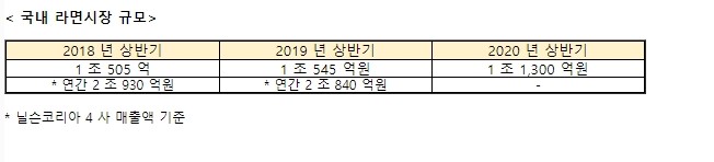 라면 소비 폭발적 증가22일 농심이 발표한 올해 상반기 라면시장 트렌드에 따르면 코로나19 영향으로 라면 소비가 늘어나면서 라면시장은 큰 폭의 성장을 보였다. 올 상반기 국내 라면시장은 전년 대비 7.2%가 늘어난 약 1조1300억원 규모를 보이며, 반기 실적으로 역대 최대 기록을 달성했다. 2조원대에서 횡보하는 라면시장에서 이 같은 반짝 성장은 ‘위기에 강한 식품’ 이라는 라면의 특징을 또 한 번 증명했다.