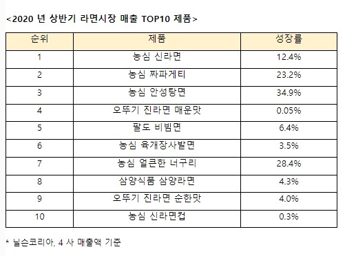 신라면은 올해 상반기 매출이 전년 동기 대비 12.4% 성장했고, 짜파게티는 23.2%, 안성탕면은 34.9%, 얼큰한 너구리는 28.4%의 성장률로 압도적인 우위를 보였다.