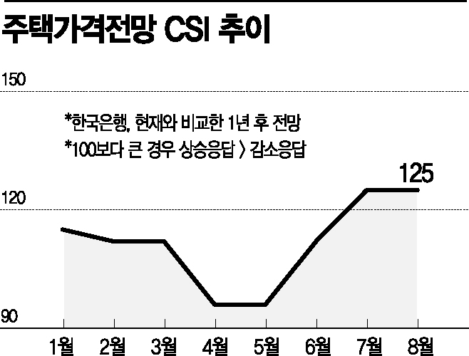 25일 한국은행이 발표한 '2020년 8월 소비자동향조사'에 따르면 이번달 주택가격전망CSI는 125로 전월과 같았다. 최근 몇 달간 주택가격전망CSI는 가파르게 상승해 왔다. 4월과 5월 96이었던 수치는 6월 112, 7월엔 125로 급등해 역대 최고치인 128(2018년 9월)에 바짝 다가섰다. 이와 같은 상승세를 멈추는 데에는 정부의 대책이 영향을 미친 것으로 보인다. 한은 관계자는 "정부의 주택시장 안정대책 등의 영향으로 전국 아파트 매매가격 오름세가 둔화하며 전월 수준이 유지됐다"고 말했다.