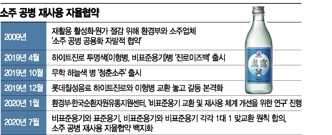 업계는 2009년 소주 공용병 재사용 활성화와 편의성 제고를 목적으로 자발적 협약을 맺고 같은 모양의 초록색 병을 사용해왔다. 가장 유통량이 많은 '참이슬' 병을 공동 제작, 사용해 재사용률을 늘리기로 했다. 하지만 지난해 4월 하이트진로가 투명색 병에 담긴 '진로이즈백'을 출시하면서 갈등이 시작됐다. 롯데칠성음료는 진로이즈백의 투명색 병은 협약을 벗어난 이형병(모양이 다른 병ㆍ異形甁)이라며 반발했다. 초록색 병의 경우 각 소주업체가 타사 제품 빈병까지 회수한 뒤 공장에서 세척 과정을 거쳐 재사용하고 있다. 병 모양이 다를 경우 수거업체는 타사 제품의 이형병을 분류한 뒤, 각 사에 이를 돌려줘야 하는데 이 과정에서 별도의 비용이 발생한다.