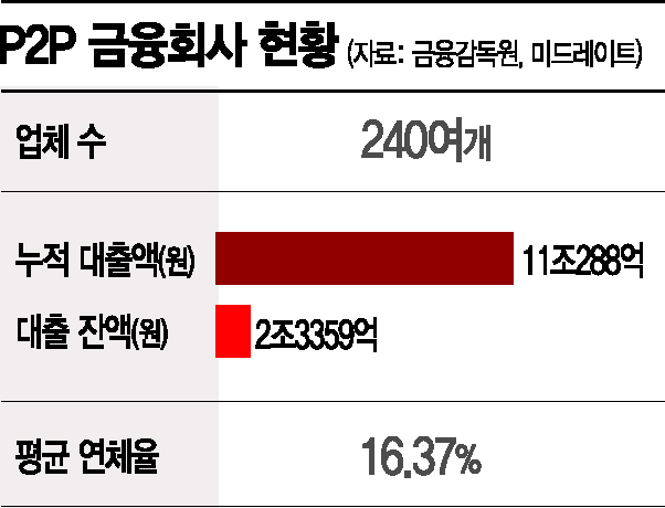연체율도 심각하다. P2P 통계업체 미드레이트에 따르면 25일 기준 141개 P2P사의 평균 연체율은 16.26%로 평균 수익률인 12.87%보다 높다. 100만원 투자해 약 13만원 벌자고 부실이 날 가능성이 높은 상품에 투자하는 셈이다. 금융권은 연체율 10%를 투자 상품의 마지노선으로 보고 있어 앞으로 P2P사는 연체율을 낮추기 위해 총력을 기울일 것으로 전망된다.자본금 규제, 소비자보호 강화법 시행으로 P2P사는 법 테두리 안에서 영업하기 위해선 1년 안에 금융위(금융감독원)에 등록해야 한다. 또 자기자본금 최소 5억원 이상, 투자자 손실 사후 보전 등 영업행위 규제방안 마련, 준법감시인 선임 등 요건도 갖춰야 한다. 요건을 갖추지 못하면 등록이 거부되거나 취소된다.