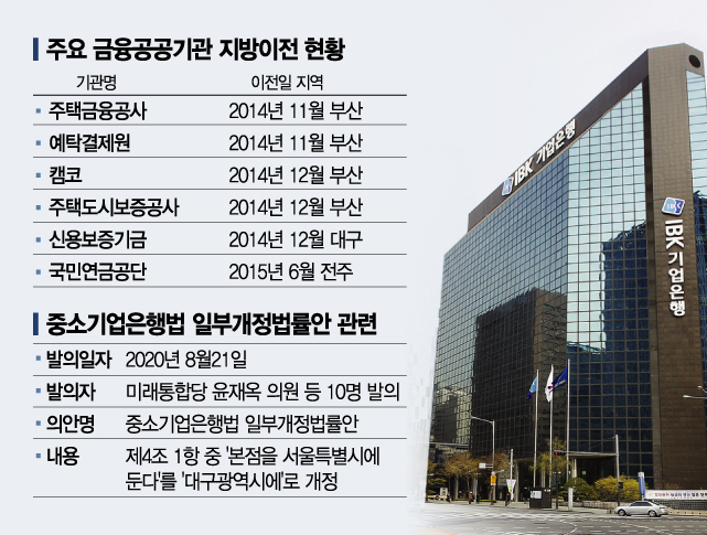 26일 금융권에 따르면 최근 미래통합당의 윤재옥 의원을 비롯한 의원 10명은 IBK기업은행 본점을 대구로 이전하는 내용을 담은 '중소기업은행법 일부개정법률안'을 발의했다. 현행 중소기업은행법에는 기업은행의 본점을 서울특별시에 둔다고 명시하고 있지만 지역균형발전 차원에서 중소기업 비율이 99.95%에 달하는 대구로 이전해 지역경제 활성화와 지역 금융 인프라 육성을 도모해야 한다는 게 골자다.