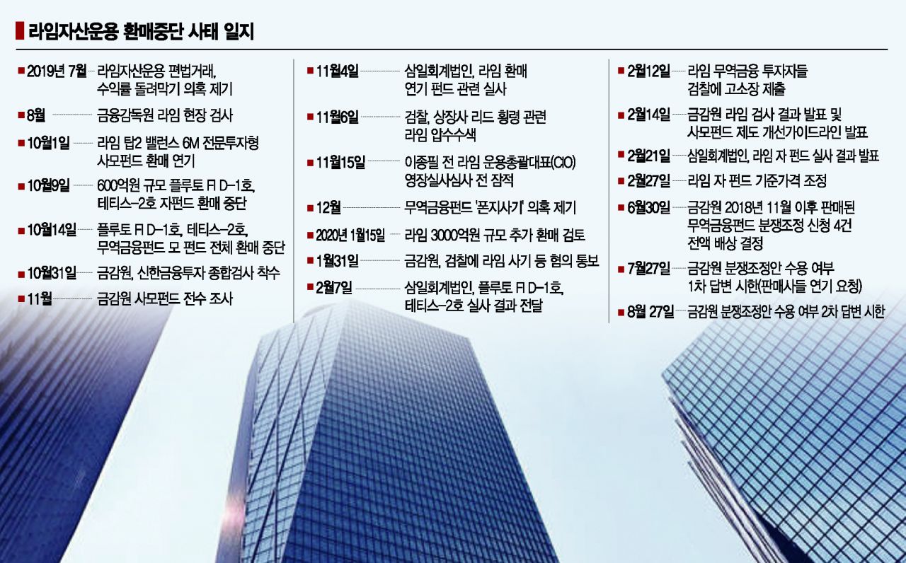 [아시아경제 김효진 기자] 라임 무역금융펀드(플루토 TF-1호) 판매사들이 27일 이사회를 열어 금융감독원이 제시한 '투자원금 100% 배상' 분쟁조정안을 수락할 것으로 알려졌다. 원금 100%를 투자자에게 돌려주는 것은 금융투자상품 분쟁조정 사상 처음이다.