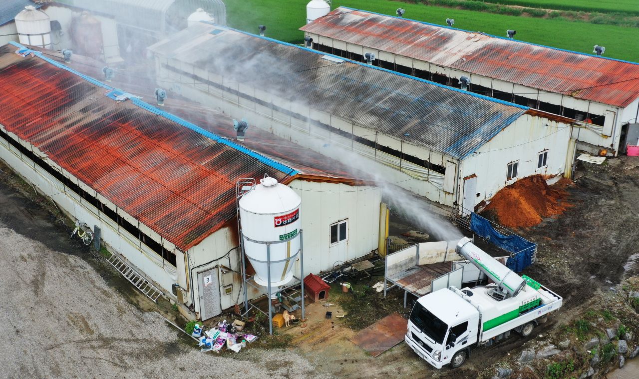 집중 호우로 아프리카돼지열병(ASF) 바이러스가 축산농가에 유입되지 않도록 방역을 하는 모습.(사진=연합뉴스)
