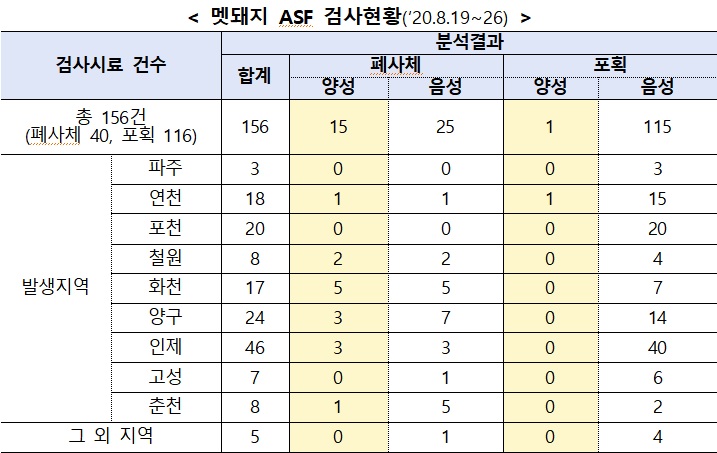 이 기간 환경부 소속 국립환경과학원에서 검사한 멧돼지 시료는 156건으로, 폐사체 시료가 40건, 포획개체 시료가 116건이었다.