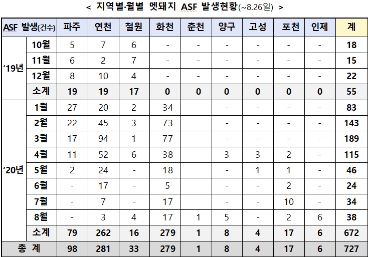 지난 19~26일에 강원도 화천군, 철원군, 양구군, 인제군, 춘천시 및 경기도 연천군에서 ASF 16건의 추가 확진 사례가 발견됐다.