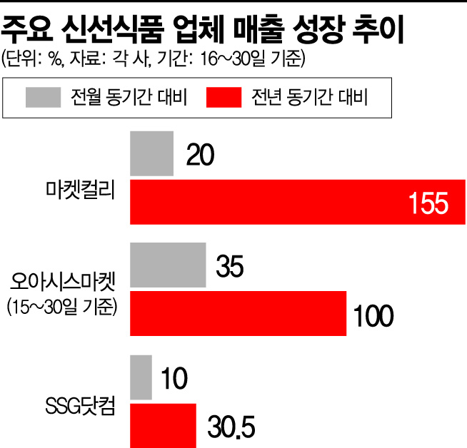 신세계 계열 통합몰 에스에스지(SSG)닷컴에서는 이달 16~30일 매출이 전월 동기 대비 10%, 전년 동기 대비로는 30.5% 늘었다. 특히 지난 주말에는 전국 마감률이 평균 98%에 달해 적정 재고량을 초과한 주문이 이어졌다. 최근 평균 주문 마감률 90~95% 대비 월등히 높은 수준이다. 코로나19 확산 초기이던 지난 2월 이후 가장 높은 수치를 기록했다. 출고량이 한정돼 있는 새벽배송도 30일 오후에 31일 새벽배송분이 일제히 마감됐다. 이날 기준 다음 날인 9월1일 배송 물량도 마감이 임박한 상태다.