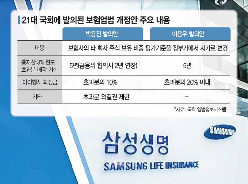 개정안은 보험업법 제106조에 담긴 보험사의 타 회사 주식 보유 비중에 대한 평가기준을 취득 당시 원가에서 시가로 변경하자는 게 골자다. 현행 법에서는 보험사의 계열사 주식 보유 규모를 '총자산 3%'를 넘지 못하도록 돼 있다. 개정안이 통과될 경우 보유 주식을 처분해야 하는 보험사는 삼성생명과 삼성화재뿐이다. 삼성을 겨냥했다고 불리는 대목이다.