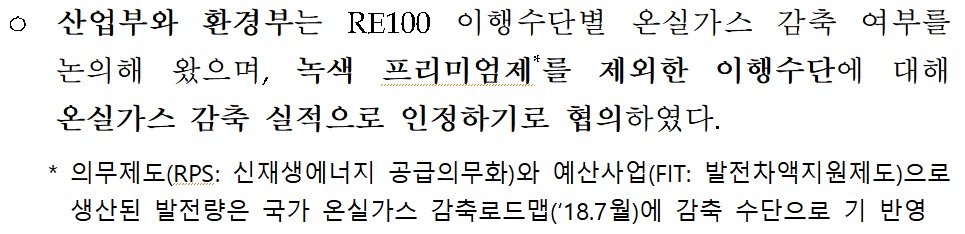 기업이 이 같은 방식으로 재생에너지를 구입하면 온실가스 감축 실적으로 인정해준다. 산업부 관계자는 "환경부와 녹색 프리미엄제를 제외한 4가지 이행수단을 온실가스 감축 실정으로 인정하기로 협의했다"며 "올 연말까지 구체적인 절차와 세부 인정 방법 등을 환경부와 협의해 발표할 예정"이라고 말했다.