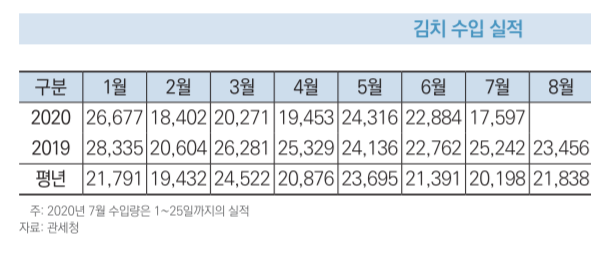 중국산 김치 수급도 어려워= 신종 코로나바이러스감염증(코로나19) 장기화로 인해 중국산 김치 수입마저 줄어들고 있다. 관세청 김치 수입 실적에 따르면 올해 1월부터 7월(1~25일)까지 김치 수입은 14만9600톤으로 전년 17만2600톤보다 2만3000톤 가량 크게 줄었다. 특히 지난 7월 김치 수입량은 1만7597톤으로 전년 대비 16%나 감소했다. 톤당 수입단가 역시 513달러로 전년보다 22% 상승했다.
