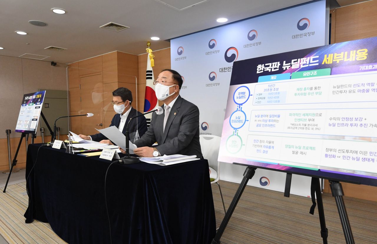 이날 홍 부총리는 정부서울청사에서 '국민참여형 뉴딜펀드 조성 및 뉴딜금융 지원방안'에 대한 브리핑을 통해 이 같이 말했다.