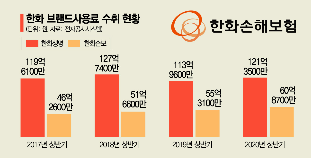 한화손보의 영업이익은 2017년 1995억원에서 2018년 1109억원으로 44.4% 감소한 데 이어, 지난해에는 863억원 영업손실로 적자전환했다. 그러나 브랜드 사용료는 2018년 185억원, 지난해 207억원을 내면서 해마다 증가 추세를 보이고 있다. 올해는 지난해 대비 6.8% 증가한 221억원의 브랜드 사용료를 낸다고 공시했다.