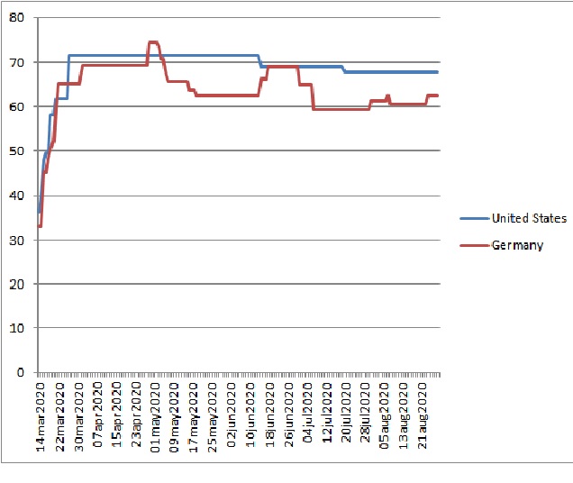 옥스포드대학이 코로나19에 대한 정부의 반응(봉쇄조치 등)을 지수화한 '옥스포드 코로나19 정부반응 추이'. 미국과 독일 등 대부분의 반응정도가 떨어지고 있다.