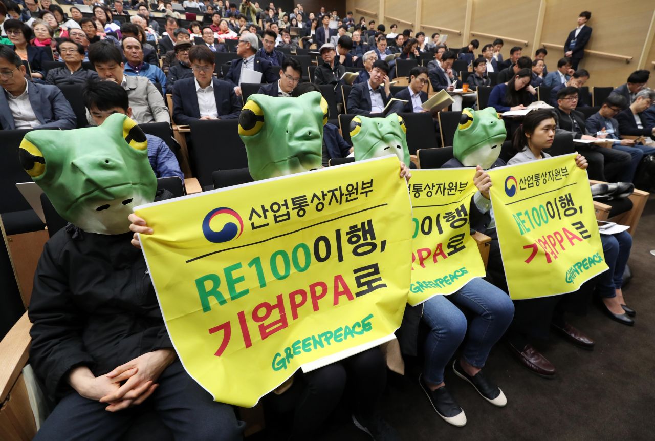 산업통상자원부 주최로 지난해 4월19일 서울 강남구 코엑스에서 열린 제3차 에너지기본계획 공청회에서 그린피스 관계자들이 'RE100(Renewable Energy 100) 이행, 기업 전력구매계약(PPA)'라는 문구의 현수막을 들고 있는 모습. /문호남 기자 munonam@