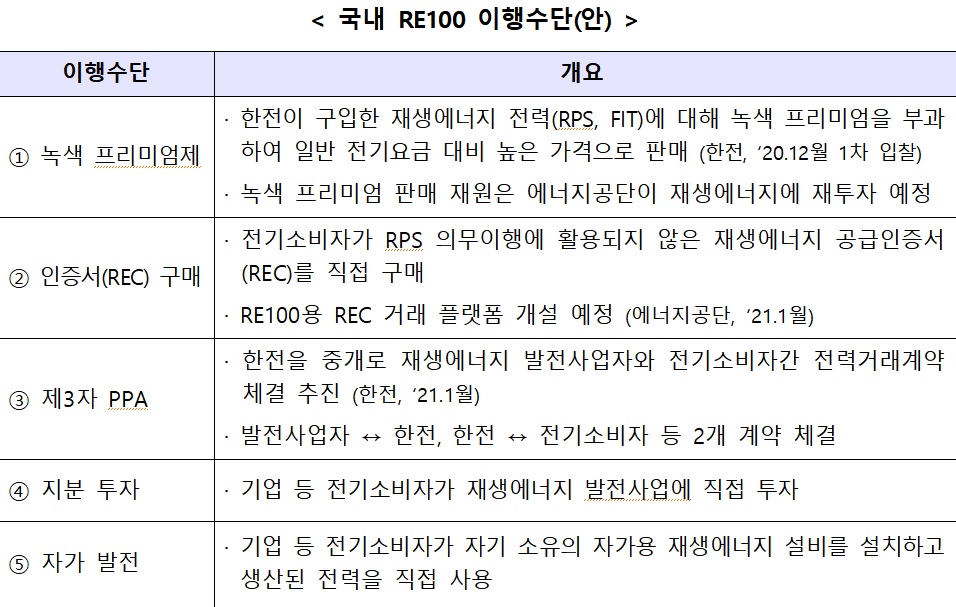 [아시아경제 문채석 기자]정부가 내년부터 RE100을 시행하기 위해 5가지 이행 수단을 내놨지만 기업들은 비용 증가를 우려하고 있다. 국제 여론과 시민단체의 압박을 의식해야 하는 입장인 글로벌 기업과 납품 업체가 아닌 이상 단가가 비싸고 수급 안정성이 낮은 재생에너지를 사야 할 이유가 없다는 반응이다. '결국 가야 할 길을 간다'는 취지엔 공감하지만 재생에너지 구입을 온실가스 배출권 실적으로 인정하는 체계를 정교하게 마련한 후 이를 명시하는 등 구체적인 각론 마련이 필수라는 조언이 나온다.