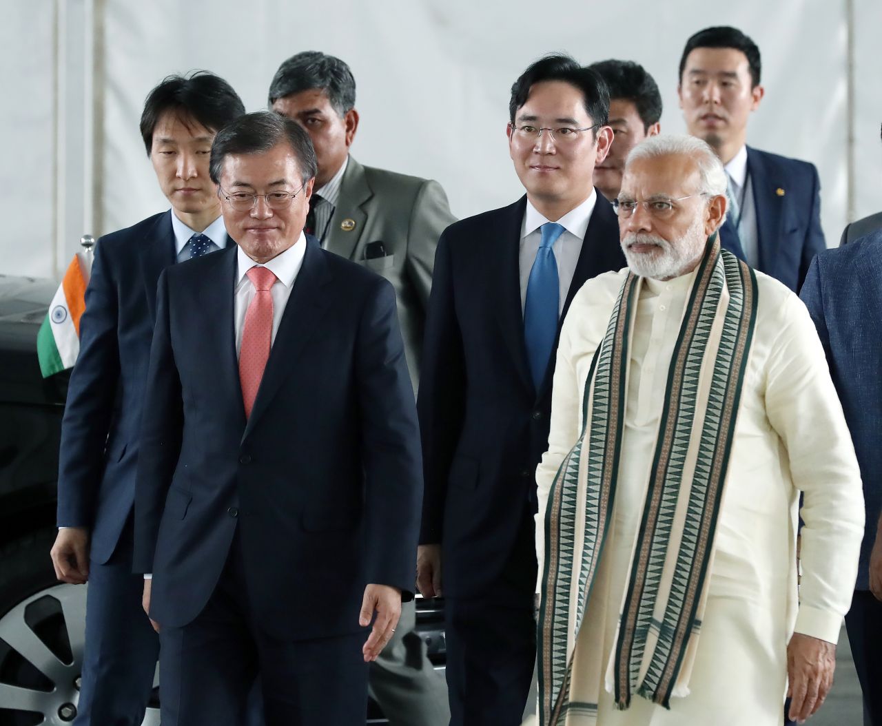 지난 2018년 인도 우타르프라데시주 노이다시 삼성전자 제2공장 준공식에 참석한 문재인 대통령과 이재용 삼성전자 부회장, 나렌드라 모디 인도 총리. [이미지출처=연합뉴스]
