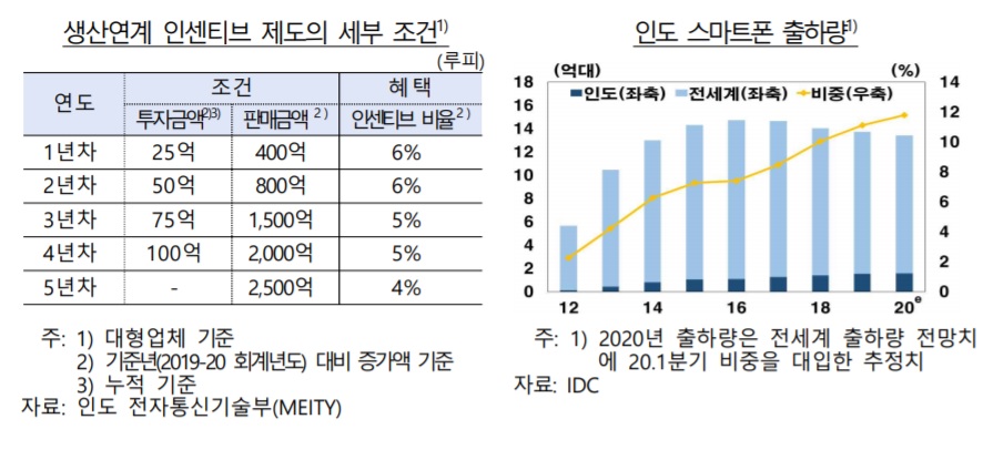 PLI에 참여하는 업체들의 스마트폰(부품 포함) 생산 및 수출 규모는 향후 5년간 각각 1530억달러, 980억달러 수준에 달할 전망이다. 한은은 "더불어 인도 내 약 120만개의 직·간접적 일자리 창출도 기대된다"고 덧붙였다.