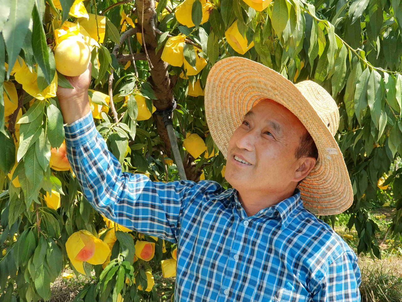 충북 괴산에서 권순수 농부가 대향금 황도 복숭아를 재배하고 있는 모습. (사진=롯데마트 제공)
