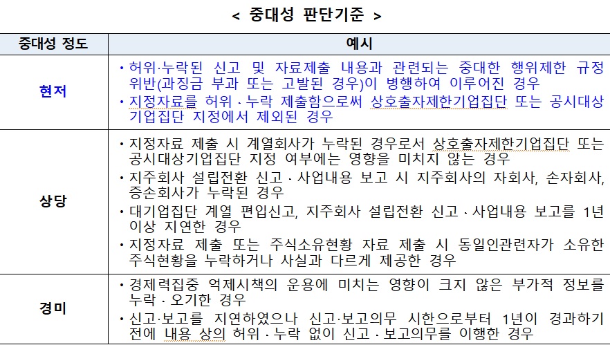 인식 가능성이 '상당한(중)' 경우에도 위반 사유가 중대하면 검찰에 고발한다. 인식 가능성이 '상당한 경우'는 ▲제출의무자 또는 대리인 본인이 지분 대다수를 소유한 회사를 누락하거나 허위 기재한 지정자료를 낸 경우 ▲동일인이 소유한 주식 현황을 누락하거나 허위 기재해 주식 소유현황 자료를 낸 경우 ▲친족 관계, 거래 관계, 출자 관계 등에 비춰 행위자가 제출자료에 허위 또는 누락이 있다는 사실을 인식할 가능성이 상당한 경우 ▲최근 3년 안에 같은 위반행위로 공정위로부터 경고 이상의 조치 받은 사실이 있는 경우 등이다.