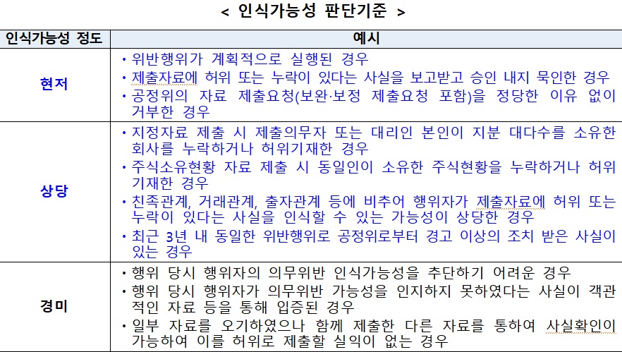 공정위는 ▲위반행위가 계획적으로 실행된 경우 ▲제출자료에 허위 또는 누락이 있다는 사실을 보고받고 승인 내지 묵인한 경우 ▲공정위의 자료 제출 요청(보완·보정 제출요청 포함)을 정당한 이유 없이 거부한 경우 등은 인식 가능성이 '현저히 높다(상)'고 보고 즉시 검찰에 고발할 방침이라고 밝혔다.