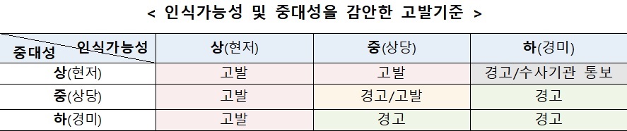 고발지침 상 검찰 고발 사항은 ▲인식 가능성과 중대성 모두 현저히 높은(상) 경우 ▲인식 가능성이 상당히 높고(중) 중대성이 현저한(상) 경우 ▲인식 가능성과 중대성 모두 상당히 높은(중) 경우 등이다. 다만 인식 가능성·중대성이 상당이 높을 경우엔 자진신고 여부, 대기업집단 소속 여부 등을 고려해 고발 여부를 결정한다.