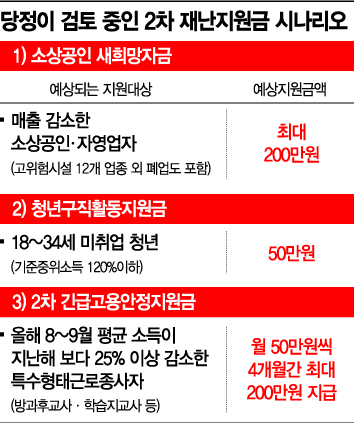 ◆문턱 낮춘 2차 재난지원금= 대표적으로 당정은 코로나19로 폐업한 소상공인까지 지원 대상에 포함하기로 했다. 이날 민주당 정책위 관계자는 "코로나19로 폐업한 소상공인도 지원하기로 했다"며 "지원 대상은 코로나19 발생 이후 폐업한 소상공인으로 폐업 시기, 지원금액 등 세부적 내용은 오는 10일 비상경제회의에서 확정될 것"이라고 덧붙였다. 노래연습장ㆍ뷔페ㆍPC방 등 사회적 거리두기로 영업이 중단된 고위험시설에 대해선 카드 매출 실적 등 매출 감소 입증 없이 최대 200만원의 2차 재난지원금을 지급할 예정이다. 당초 정부는 100만원+α 규모로 계획했으나 "규모가 너무 적다"는 불만이 제기되자 지원 규모를 확대하기로 한 것이다.