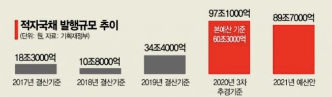 채권시장 수급 우려 때문에 국채 금리는 오름세를 보여 왔다. 이날 서울 채권시장에서 3년 만기 국고채 금리는 전 거래일보다 2.4bp(1bp=0.01%포인트) 내린 연 0.949%에 장을 마쳤다. 10년물 금리는 연 1.555%로 1.7bp 하락했다. 이날 국고채 금리는 전날보다 내리긴 했지만, 지난 8월 말부터 꾸준히 올라 최근 금리수준은 코로나19 불안이 극에 달했던 4월과 비슷하다.
