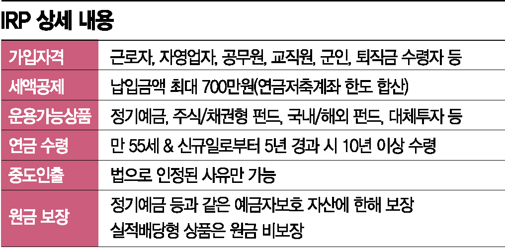 개인형 퇴직연금(IRP)은 확정급여형), 확정기여형 등과 같이 퇴직연금계좌의 하나로서 2012년 7월26일 근로자퇴직급여보장법이 개정되면서 도입됐다. 퇴직연금이지만 세제혜택 및 가입자가 추가로 입금할 수 있다는 점에서 개인연금의 성격도 갖는다. 근로자가 은퇴 전 이직할 때마다 받는 퇴직금을 적립하고, 퇴직금 외에 가입자가 추가로 자유롭게 입금을 하고 상품 운용도 하다가, 향후 연금 등 노후자금으로 활용할 수 있다. 근로자는 퇴직금을 받을 때 퇴직금을 입금받을 개인형IRP 계좌를 개설해야 하는데 퇴직금 이외에 추가로 입금한 가입자부담금에 대해 연금저축처럼 세액공제 혜택을 준다.연금저축펀드·연금저축보험·연금보험…개인이 일반 금융기관 통해 가입 운용 가능