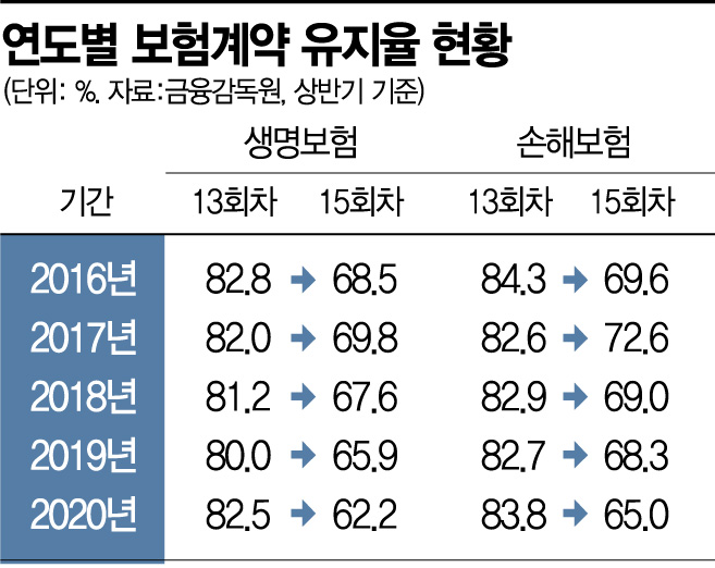 보험 가입 이후 2년 이상 계약을 유지하는 비율을 뜻하는 25회차 유지율이 생명보험은 평균 62.2%로 전년 동기 대비 3.7%포인트 하락했다. 2017년 상반기 69.8%를 기록한 이후 매년 떨어지는 추세다.